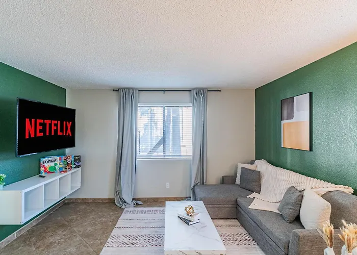L'appartamento Near Casino Pool Gym Balcony Parking Washer Dryer Scottsdale si trova a 2 km dal Papago Plaza Shopping Center e offre un centro fitness. Gli ospiti possono usufruire di Wi-Fi sia per motivi di lavoro che di svago.